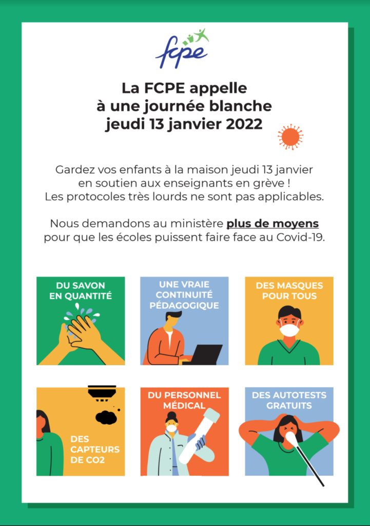 Journée de mobilisation nationale le jeudi 13 janvier 2022 Post author:bureau Post published:12 janvier 2022 Post category:Non classé Le 13 janvier prochain, la FCPE lance la journée blanche en appelant les parents à ne pas envoyer leurs enfants à l’école ! Vous devriez également aimer Liberté, Egalité, Fraternité, Laïcité 23 octobre 2020 Nuit de l’orientation le 4/3/21 26 février 2021 Invitation au forum « Ma course d’orientation » organisé par la FCPE31 les 18 et 22 novembre 2023 à Toulouse 14 novembre 2023