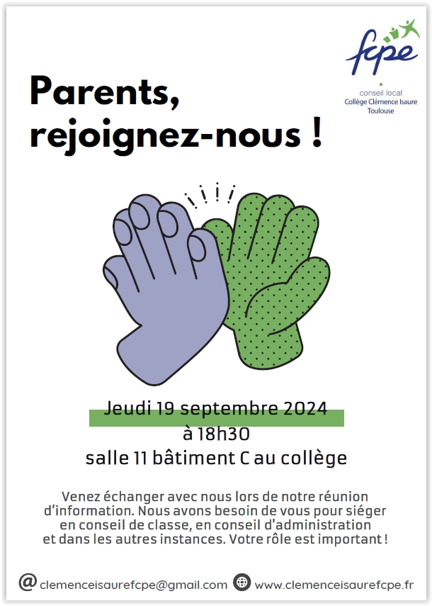Réunion d’informations parents – Conseil Local FCPE – 19/09/24 18h30 Post author:bureau Post published:12 septembre 2024 Post category:Réunion Lien d’adhésion en ligne FCPE : ICI Vous devriez également aimer Réunion de rentrée : lundi 20/9/21 à 18h30 11 septembre 2021 Réunion Parents d’élèves de 6ème le 10/09/20 9 septembre 2020 Assemblée Générale de rentrée 21 septembre 2021